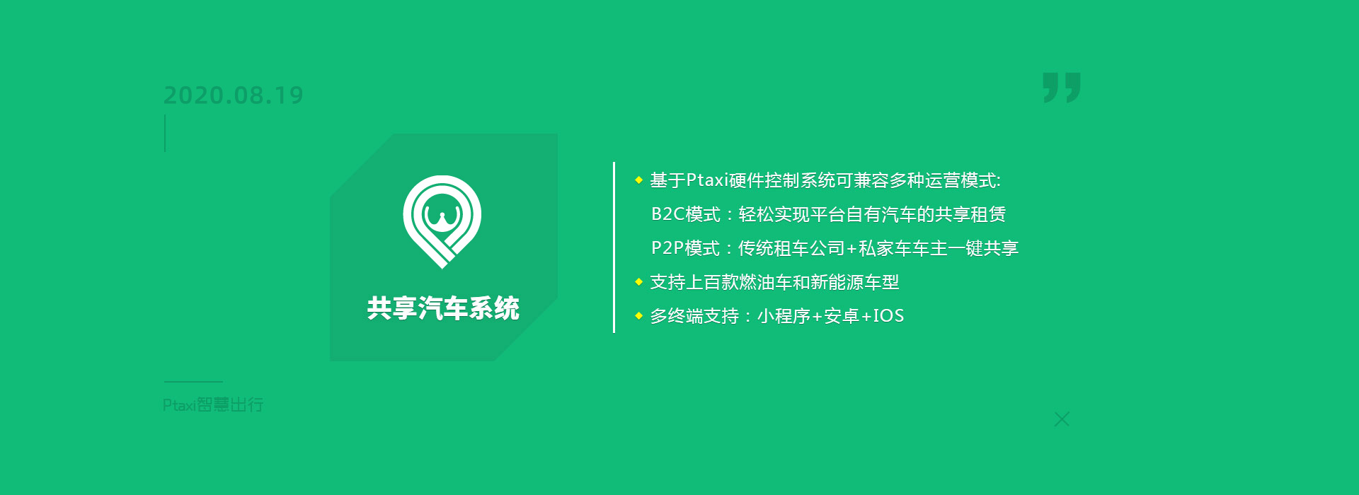 Ptaxi拥有快车、专车、顺风车、租车、代驾、出租车、跑腿、共享汽车等多项功能,可根据需求自由组合,快速定制属于自己的网约车系统
